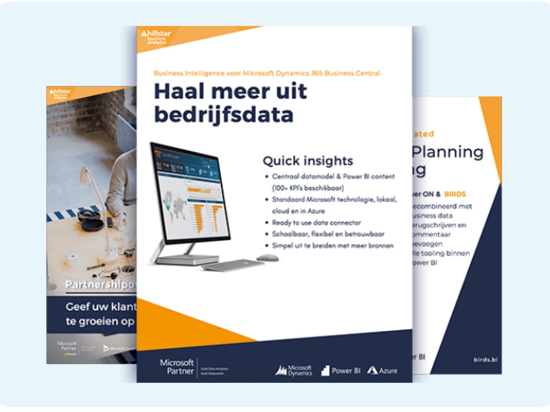 Met Birds leveren we een complete BI oplossing binnen zeer korte tijd. Deze oplossing bestaat uit een Datahub waarbinnen alle relevante data wordt samengevoegd. Daarna maken we deze beschikbaar binnen de reeds geprepareerde standaard Power BI dashboards.